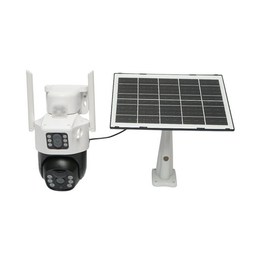 Dual-lens surveillance camera 6 mp, 4g, wifi 2.4 ghz with solar panel, 10000 mah battery, 360 degrees ptz, human pir detection, night vision and ubox application.