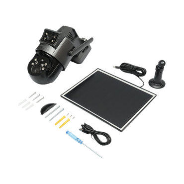 Surveillance camera with dual lens 6mp, 4g, wifi 2.4 ghz with solar panel, 13500 mah battery, ptz control, motion sensor, human detection pir, smart ir night vision, and ubox application.