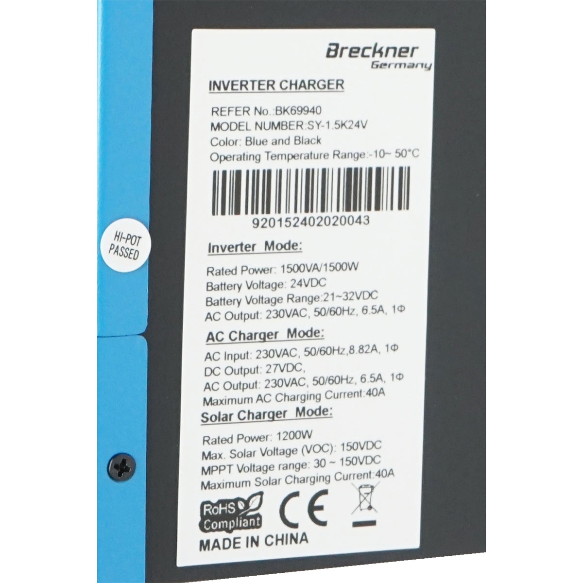 Hybrid solar inverter 1.5 KW, 24V, 40A, MPPT, single-phase, OFF-GRID, SY-1.5K24V Breckner Germany